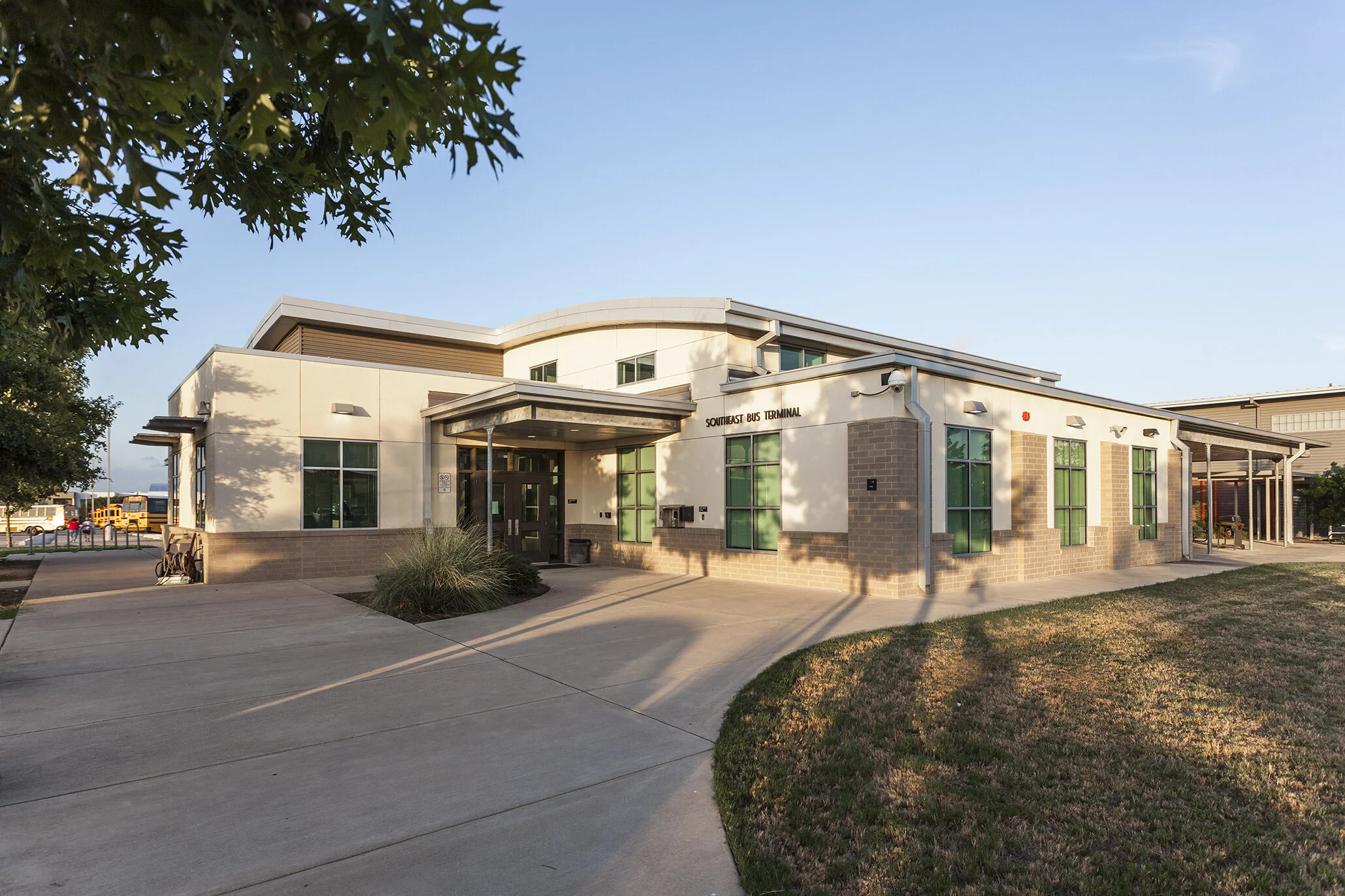 Southeast Bus Terminal and Administration Building located in Southeast Austin. Comprised of approx. 6,000 sq. ft. administration building, 11,000 sq. ft. bus maintenance building, bus wash, fueling station and approx. 180 bus storage. Designed by Jon Salinas while a lead project designer at BLGY